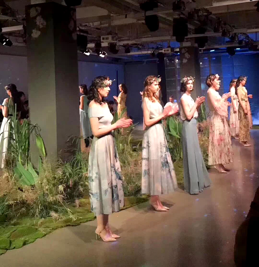 模特们头带花环,身着春意盎然的印花和飘逸灵动的衣裙,灿若仙子,款款而来,穿过冰幕在青苔丛林间漫步,整个秀场氤氲仙气弥漫。