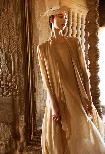 The creations are made from pure natural superior silk, rib, raw silk, linen, wool and silk wool with elegant colors and comfortable and smooth silhouettes. By adopting oriental traditional handicraft, they strive to center around people and highlight harmony to allow graceful, calm, free and romantic women to demonstrate their romantic and unrestricted free will in their tasteful life.
